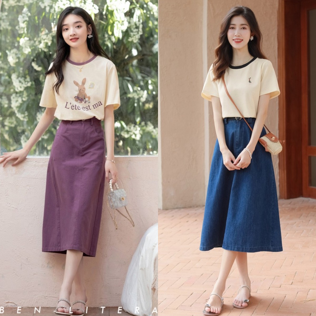 我们在拿半身裙来搭配T恤的时候,可以根据半身裙的风格来挑选T恤。比如下图博主穿的这两种牛仔半身裙,半身裙本身就带着一点温和休闲的感觉,所以我们就可以选择颜色稍微吸睛一点的印花T恤,再挎上一款小包,秒变校园少女!