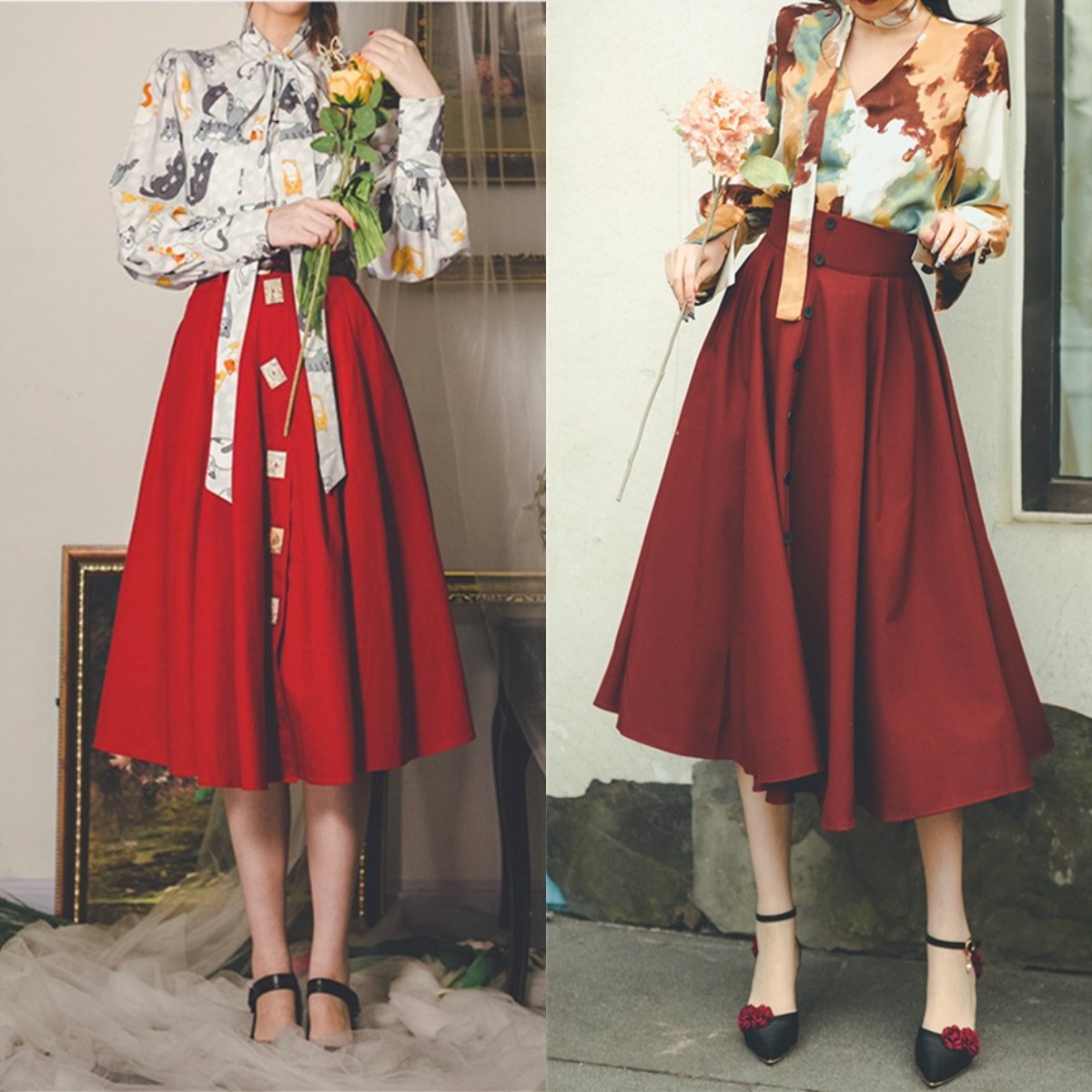 利用多色拼接元素,丰富色彩感,同时削弱纯色衬衣的枯燥乏味,能让你的造型更有趣味性。要想演绎出法式风格的造型,那就可以选择下图(右图)中的这种加入了“油画印花”设计的衬衣款式,既能增添复古属性,又能让你的搭配更有法式浪漫且高级的魅力。