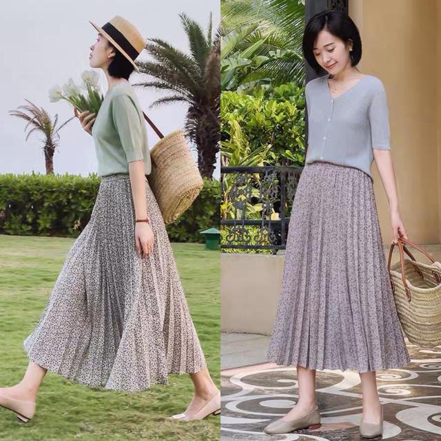在炎热的夏日季节里,我们更倾向于选择一些面料材质清凉爽滑的半身裙,加上宽松的样式,穿上身能够帮助中年女性隐藏身材问题,又获得足够的清凉感。如上图中,轻薄的冰丝短袖上衣搭配雪纺百褶半身裙,清浅柔和的配色,视觉上可以帮助我们削减一些炎热感,增添了许多少女感,仙美气质十足。