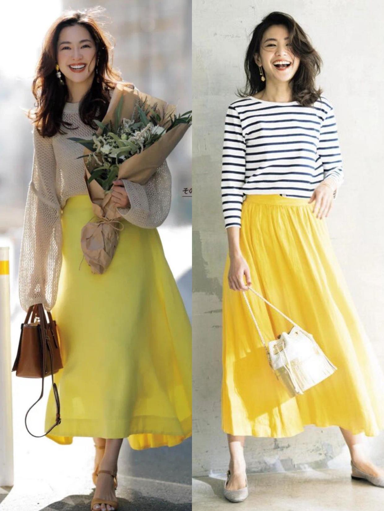 与冷色系对立的是暖色系,如果你觉得蓝色看起来太过清冷,那不妨试着入手一款元气满满的黄色半身裙,它会让人联想到热烈的阳光,温暖又明亮,与春暖花开的季节十分适配,还会与其他颜色形成调和,起到点亮暗沉的作用。因为是亮色系的半身裙,不会对整体风格产生太大的影响,所以黄黑皮也不用担心。