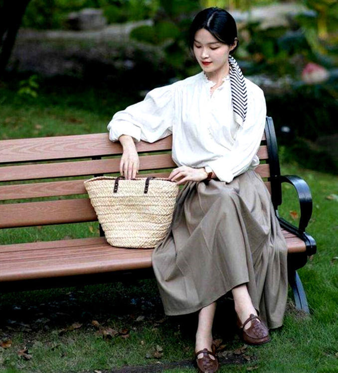 一件白衬衫,把它的衣摆扎进百褶裙里之后,