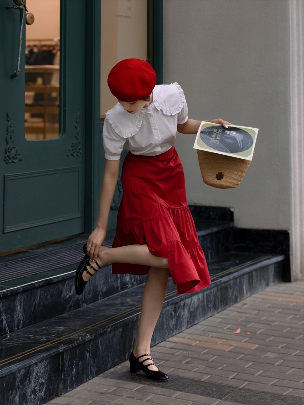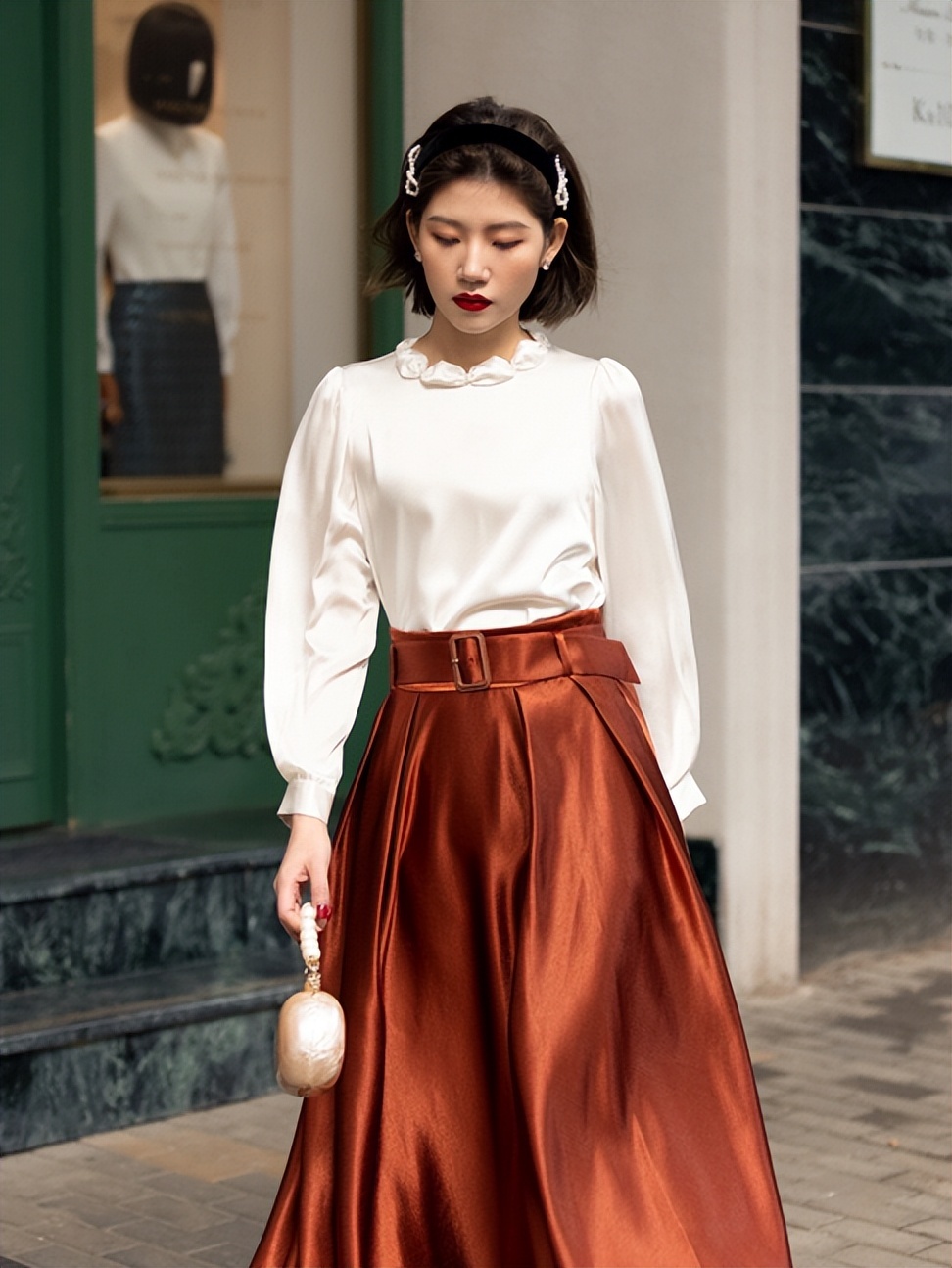 追求减龄的话,娃娃领衬衫也可以安排上,这种时髦的娃娃领设计彰显出了可爱俏皮的气质,穿起来非常温柔,而像这种宽松的白色娃娃领衬衫穿在身上也特别的清纯,能够轻松让我们看上去年轻十岁,就算你已经到了奔四的年纪,也可以用这种单品诠释出好气质。下半身搭配红色半身裙,又会觉得很有成熟韵味,太适合普通女孩参考了。