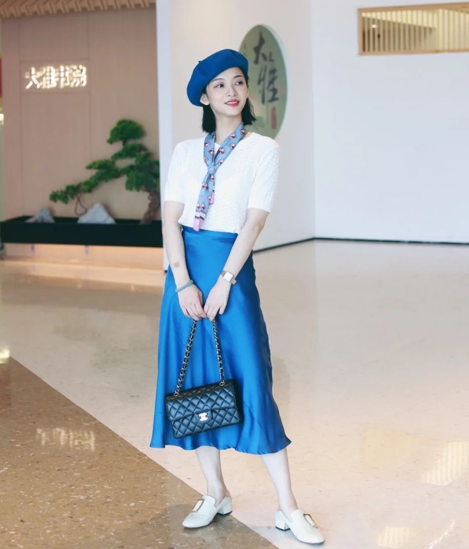 配饰不在多不在繁,而在于位置醒目、配色抢镜。一条鲜明招摇的蓝底碎花丝巾、一顶色彩鲜艳的贝雷帽,都为简单的着装赋予了耀眼的名片,让“半褶裙”的造型瞬间脱颖而出。