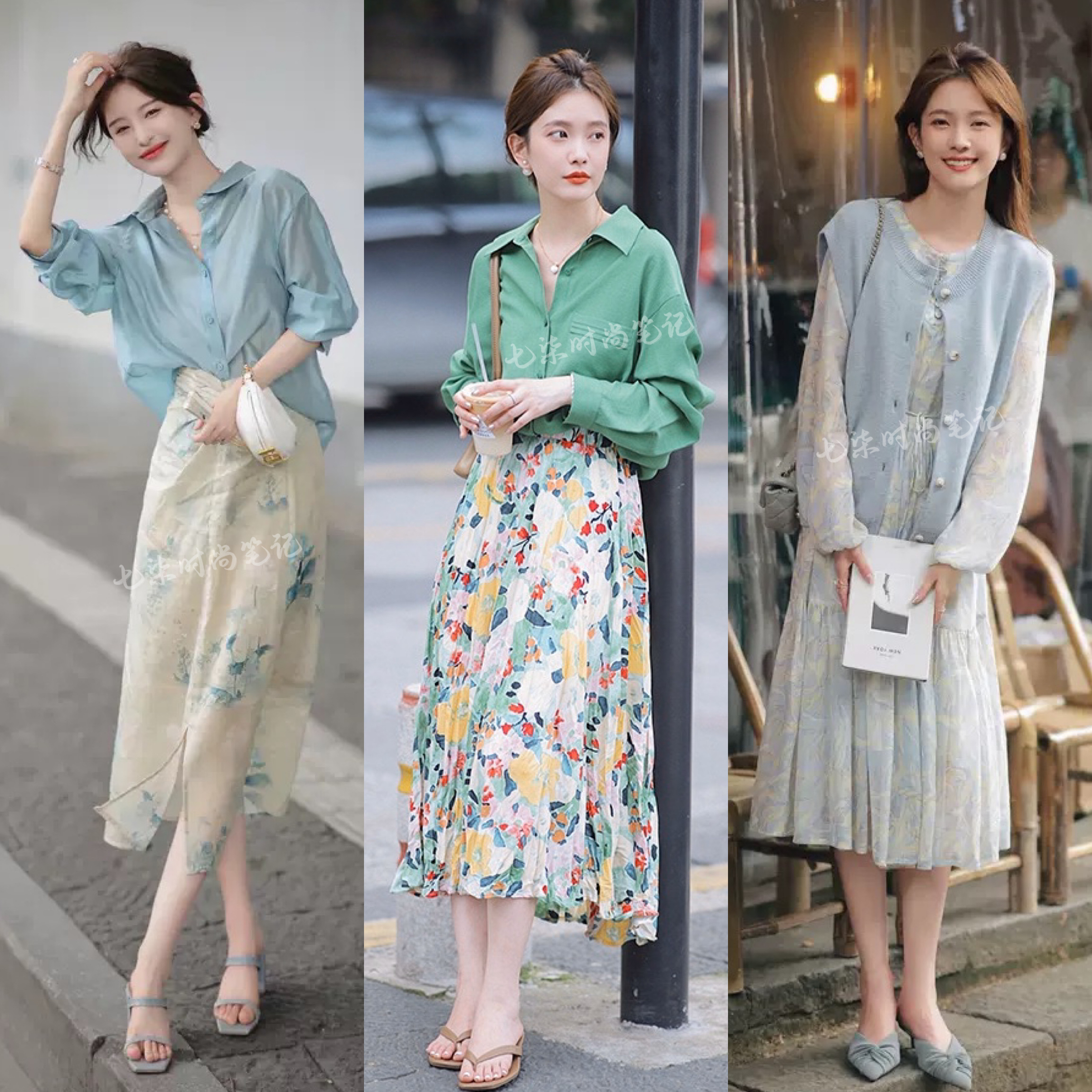 蓝色衬衫搭配同色系的印花半裙,清新干净又很有看点。也可以将深浅不同的蓝穿上身,简约有层次,高级感十足。