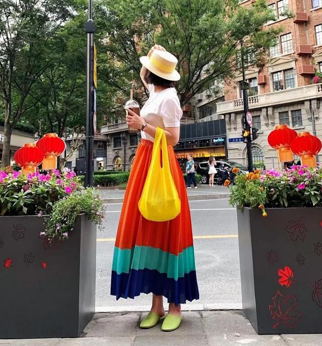 拼色设计的款式,颇有西班牙式艺术风情的味道~记得搭配的时候,要把腰线给提高起来,从而拉长下身的比例。对于这种彩色+拼色设计的裙子,上衣最好简单配一件纯色t恤就好,白色的短袖t恤就非常不错,一简一繁的结合,时髦又显层次!