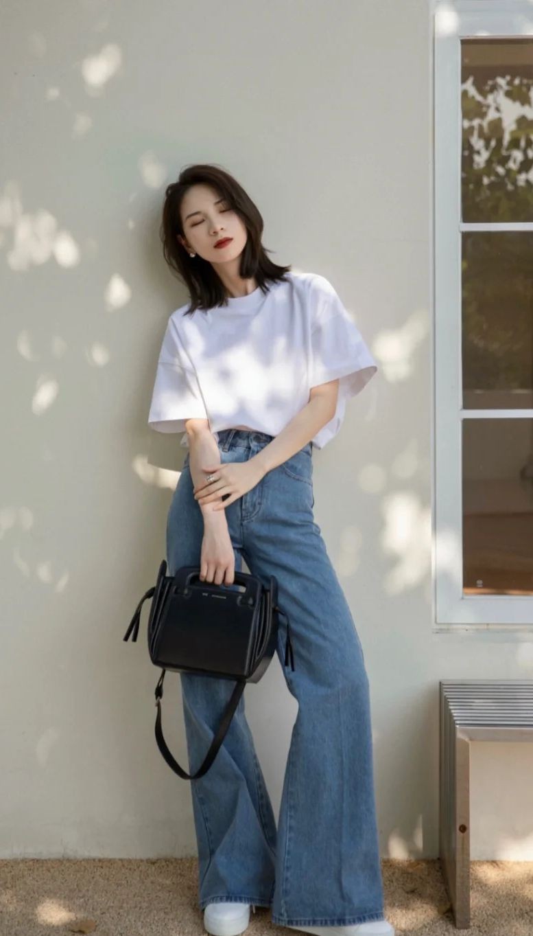 还有下面这组“纯白T恤+牛仔裤+黑色手提包”造型,也凸显出配饰单品的重要性,黑色手提包往手里一拿,优雅气质感瞬间就有了。
