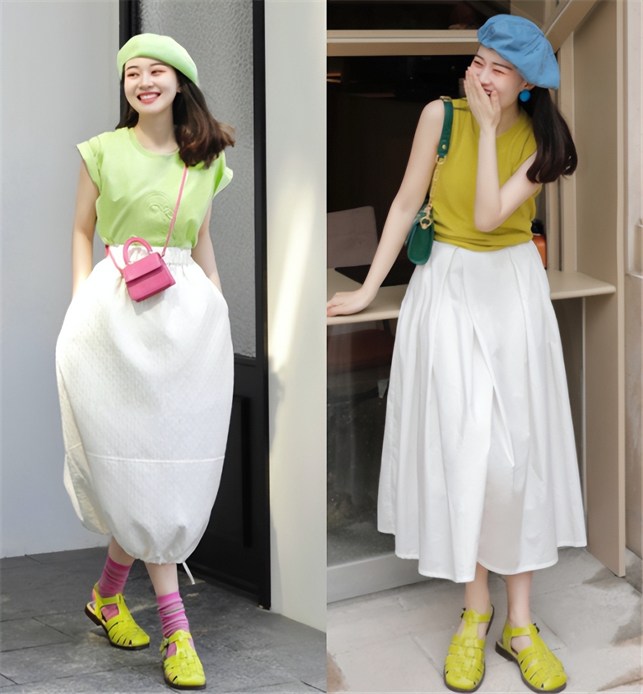 就像下面的小姐姐搭配这种牛油果绿色凉鞋,配合白色花苞裙也会显得很气质,撞色搭配还蛮有活力的,建议大家夏天可以多试试。