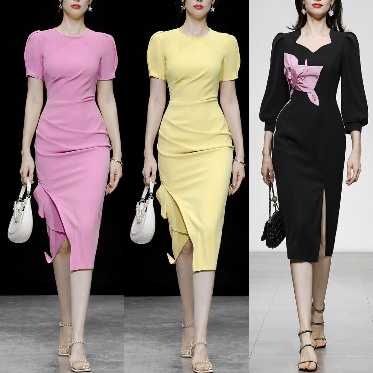 紧身开叉式的连衣裙绝对是打造性感气质的利器,贴肤的剪裁完美勾勒出身材曲线,融入当下最时兴的开叉设计轻盈又显瘦,高级感十足。