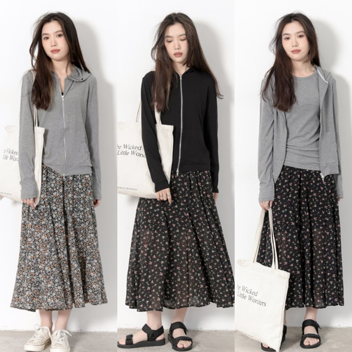 深色系的碎花裙,搭配上基础色的外套,一浅一深,刚好可以削弱沉闷感,如果想要穿出更显瘦的效果,那么整体深色系也不错。黑色外套搭配一件黑色碎花裙,再利用白色包包进行综合,就可以让风格统一起来。