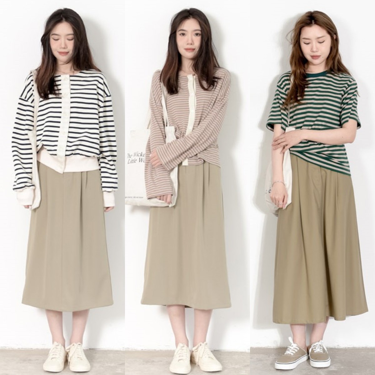A字款式的卡其裙,搭配上条纹元素的上衣,营造出平衡状态。而横向条纹在视觉上可以延伸线条,和纵向条纹相比要更显时尚气息,同时还能造型更立体。