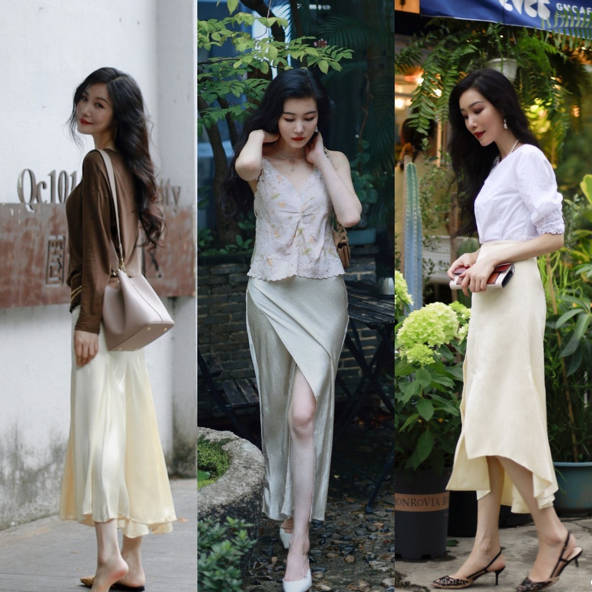 如果想让你的夏季穿搭更加灵动飘逸,不妨入手下图(中间)中的这种材质相对轻薄一些的a字半身裙。加强透气感不仅可以满足温度需求,还能让你的裙摆更加具有飘逸感,夏天穿完全不会显得闷热。