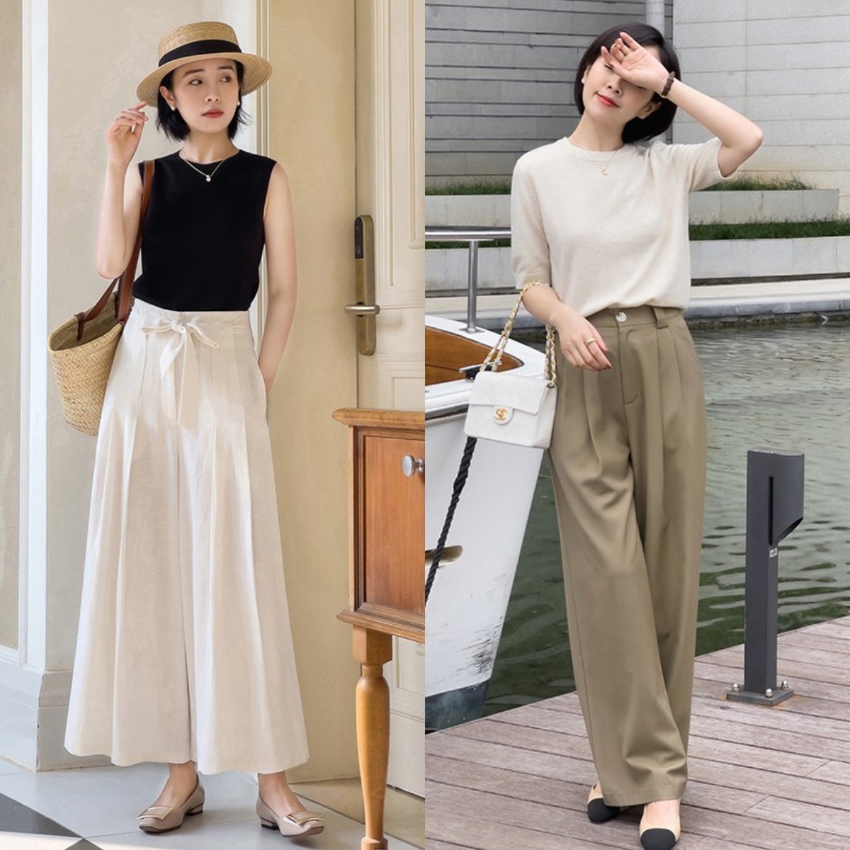 除了直筒裤,还有阔腿裤也是不错的选择,相比直筒裤,阔腿裤要更加宽松一些,对腿部的包容性也是极强的,建议选择轻薄透气的面料,在夏天穿会更加舒适,对于小个子而言,尽量选择高腰的款式,把上衣的衣角塞入裤子里,露出腰线,便能显高显腿长了。