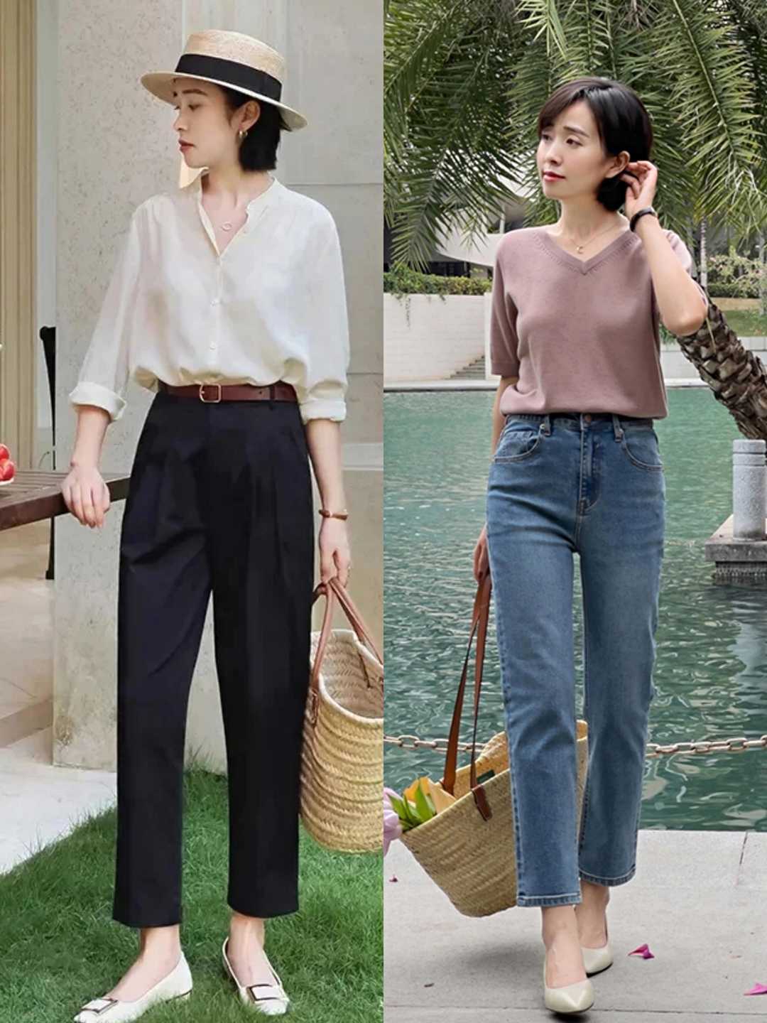 夏天也有不少女人是喜欢穿裤装的,相比裙装,裤子要更加方便一些,版型尽量选择宽松的款式,如果太过于修身,那么对身材的要求是极高的,驾驭不好很容易暴露身材的缺陷。直筒裤的松紧程度适中,可以选择西装、牛仔面料的款式,不仅垂感强、版型利落,对腿部的修饰效果也是极其出色的。
