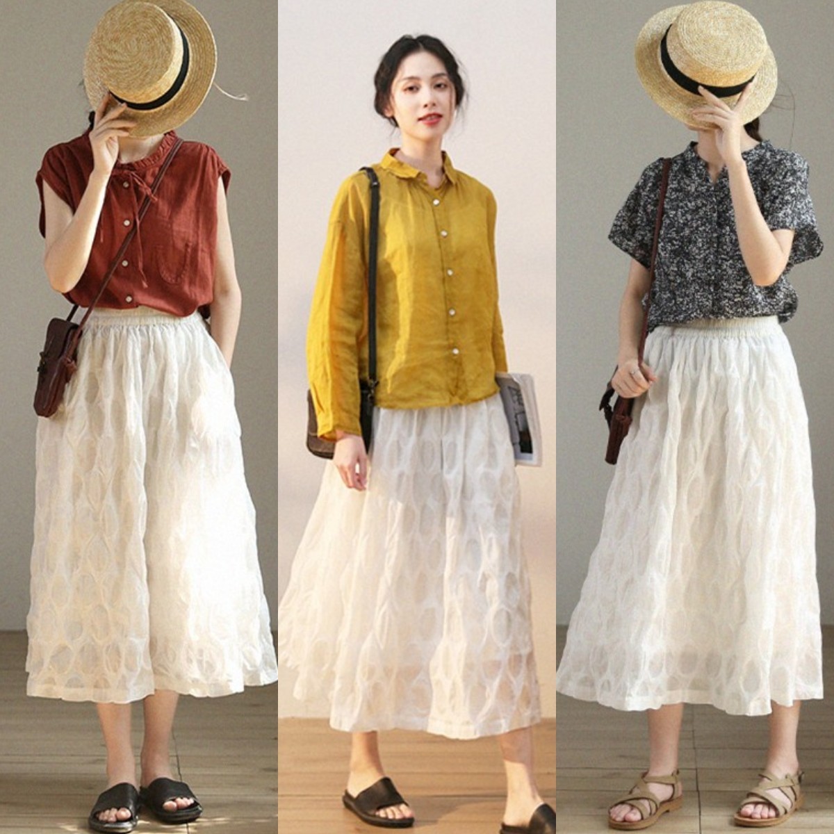 想要用半身裙的搭配来达到修饰身材的效果,那就一定要注重腰线在身材比例中的重要作用。提升腰线可以在视觉上最大程度的优化身材比例,显高还显瘦。