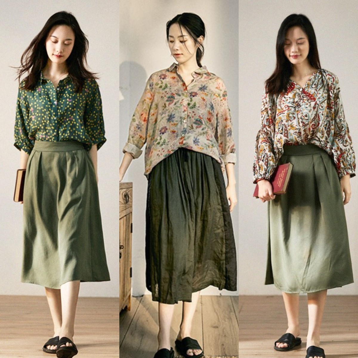 想要穿出减龄的姐妹们,也可以选择一字领的衬衫来搭配半裙。一字领的领口设计可以营造出更大的露肤面积,秀出锁骨线条更显性感清凉,妥妥的韩系小姐姐即视感。