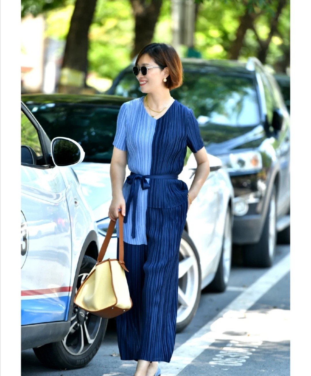 例如这条宝蓝色的连衣裙,它也是不具备明确年龄禁锢的一大单品,色调的使用很高级,印花图案的形成并不会密集或者是繁多,而是保留了简单的图案衔接,腰带一收,更有对身材的修饰作用。