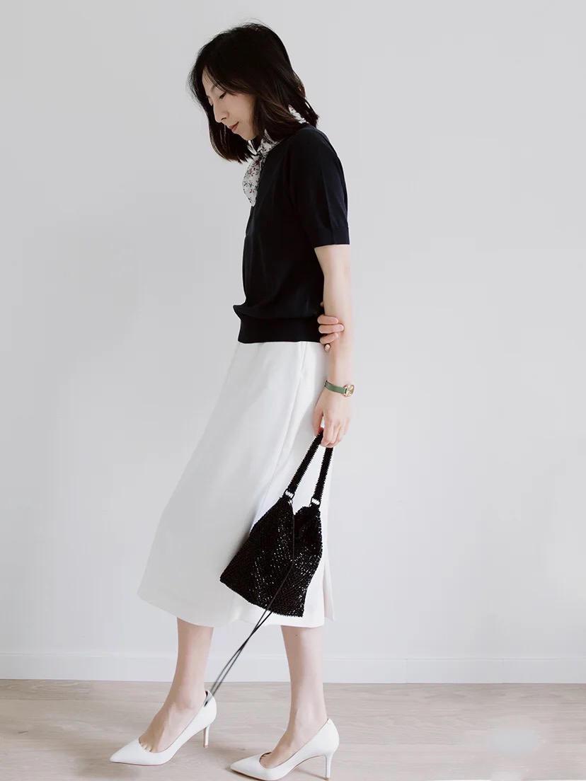 黑白搭配就是最经典的极简风的代表,可以根据身材的特点调节黑白色的位置,如果上半身微胖、下半身苗条,那么可以把黑色穿上上半身,白色运用于下半身,这样黑色可以在视觉上起到显瘦的作用,白色用于转移视线,放大下半身的优势,同时包包、鞋子也都选用黑白色的款式,与服饰相互呼应,将极简风发挥到极致。
