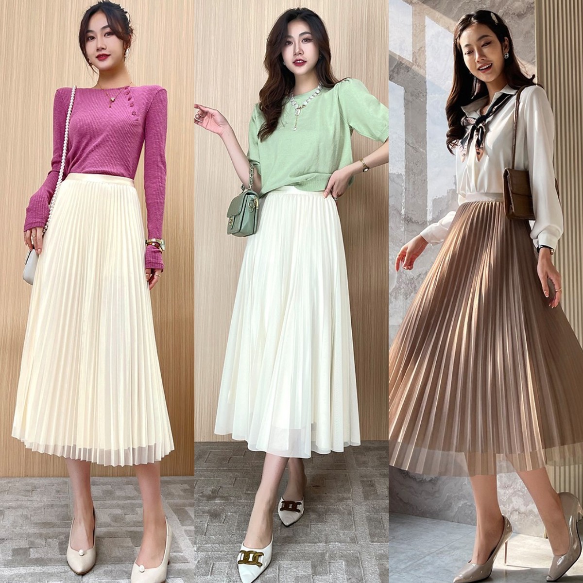 要是觉得百褶裙不够日常,40+的姐妹们也可以选择压褶处理的半身裙,它既保留了百褶裙的俏皮灵动,款式也更加得体日常,就算是通勤穿也毫无压力。