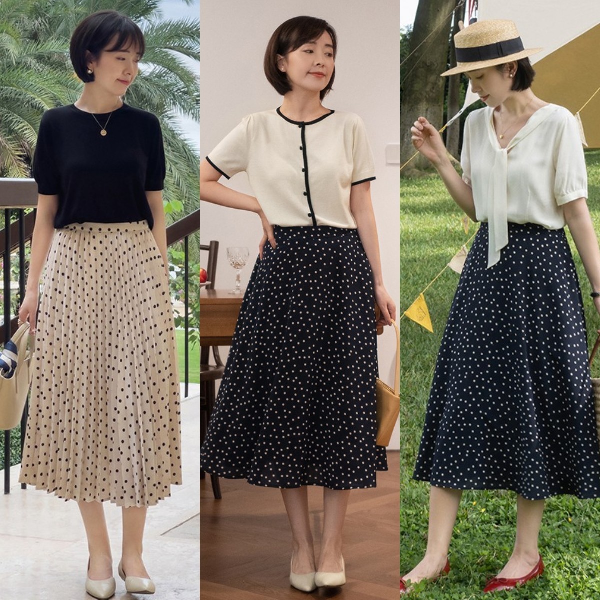 像波点半身裙这样图案较为繁杂的款式,推荐大家选择质地较为柔顺的款式,看起来会更加轻盈,不至于给人眼花缭乱的感觉。下图中的雪纺波点半身裙就是非常不错的选择,飘逸又浪漫,减龄又时髦。