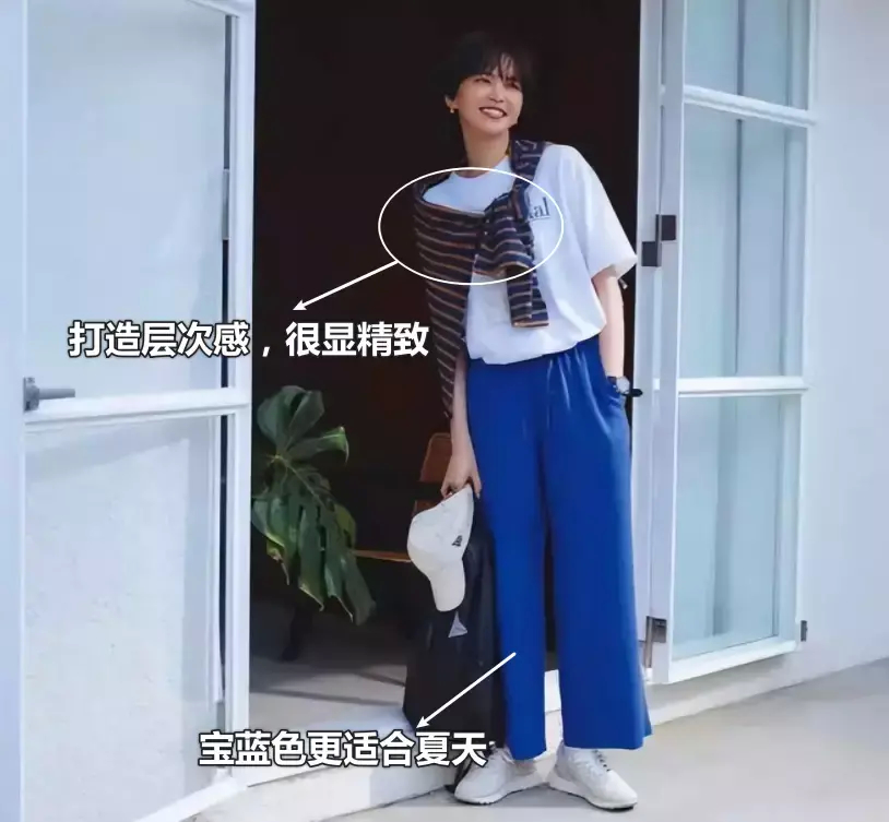一般来说,宝蓝色休闲裤用白T恤来搭配即可,若是想要更加别致一些,可以通过叠穿或者加入配饰的方法来打造层次感哦。