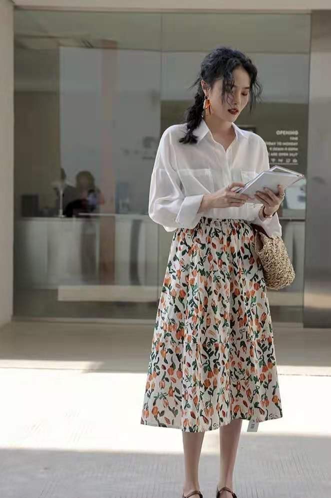 从白衬衫、碎花半身裙风格魅力上看,二者并不是很搭,前者正式、干练又利落,后者张扬、靓丽又浪漫,可就是这么两种迥然不同的单品,却制造出让人意想不到的时尚效果。好比下图中“白衬衫+郁金香碎花半身裙”搭配,时尚气息、优雅气息、甜美气息,全都有,简直好看到爆。