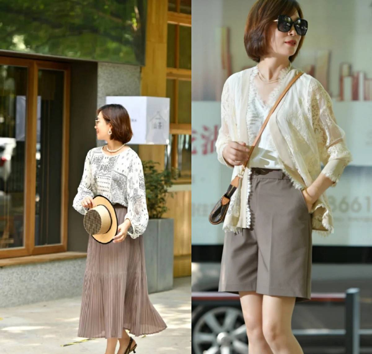 像这两款穿搭,采用的是大地色的半身裙以及短裤,女性可以根据自己的穿衣想法或者是需求进行选用。这两类单品主打的风格不一致,裙装显得飘逸,显得更灵动,具备优雅的特质,而短裤会携带休闲的、放松的感觉。