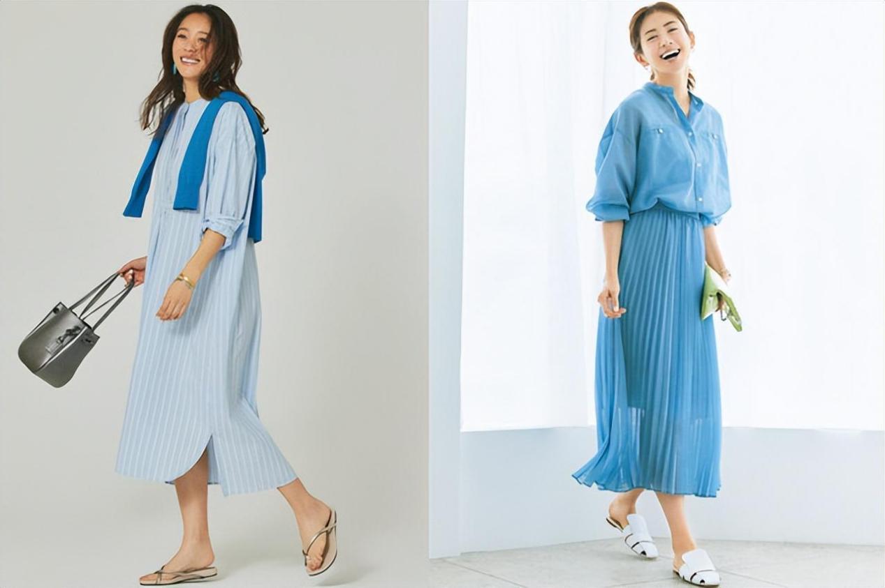 蓝色的好搭档自然是白色,蓝白配色,就是蓝天和白云的匹配,激发起人们对爽朗夏日的热情,能选择的单品自然有蓝色T恤、防晒衣、衬衫,白色的长裙、短裤、长裤。