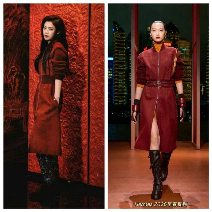爱马仕的利落从不是 “硬绷的冷锐”,是 “能裹着舒展的酷美”—— 陈丽君这波芭莎艺术大赏的爱马仕 2026 早春造型,直接把秀场款的 “锐” 改成了自己的 “大女主舒展”:酒红麂皮裙是 “柔的利” 不是 “硬的壳”,暖橙内搭是 “透的柔” 不是 “闷的撞”,简化秀场的繁复配饰后,往红墙前一站,越剧身段的舒展裹着爱马仕的利落,酷美是 “她的底气”,不是 “装的标签”!