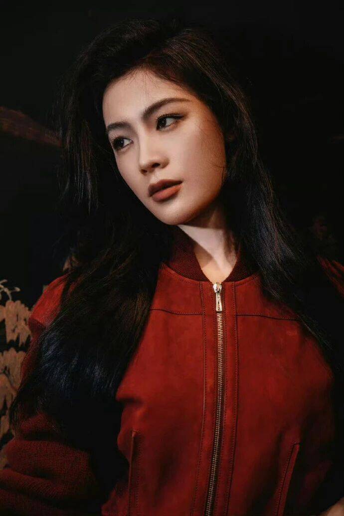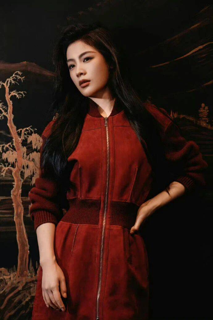 秀场款的撞色是 “锐的冲突”,但陈丽君用暖调衬出舒展——酒红麂皮裙是柔肌理的款,不是光面硬壳,裹在身上是 “软的利”;内搭选暖橙高领,不是秀场的亮黄,暖调刚好和酒红的沉搭得顺,撞色是 “透出来的柔”,不是 “刺目的锐”,越剧身段的舒展一撑,色的对冲就成了 “她的酷美底气”。