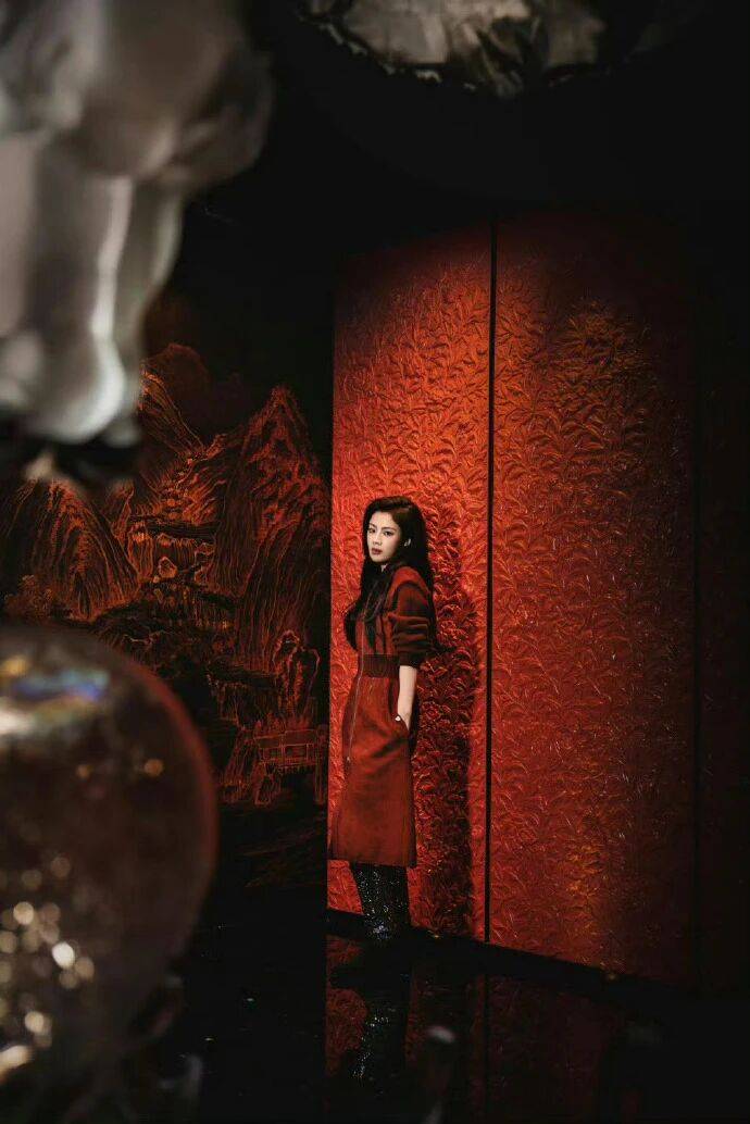 秀场的多层腰带、夸张手套是 “锐的堆”,但陈丽君简化配饰衬舒展——只留基础腰带收腰,卸了秀场的繁复装饰,让酒红裙的柔肌理成了视觉重心;没有戴秀场的厚手套,露出手腕的舒展,反而衬出 “大女主的松弛利”,不是 “硬凹的锐”。