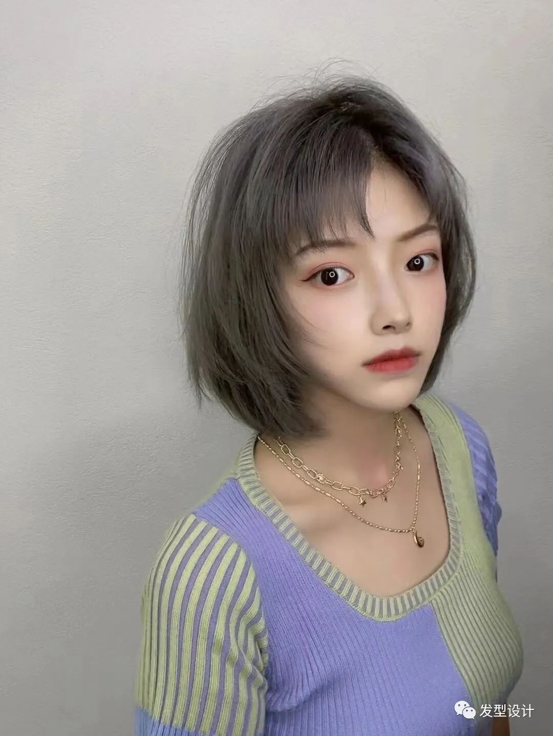 2022年最流行的短发发型女图片:齐脖位置的长度最好驾驭,搭配闷青色显白又有个性。