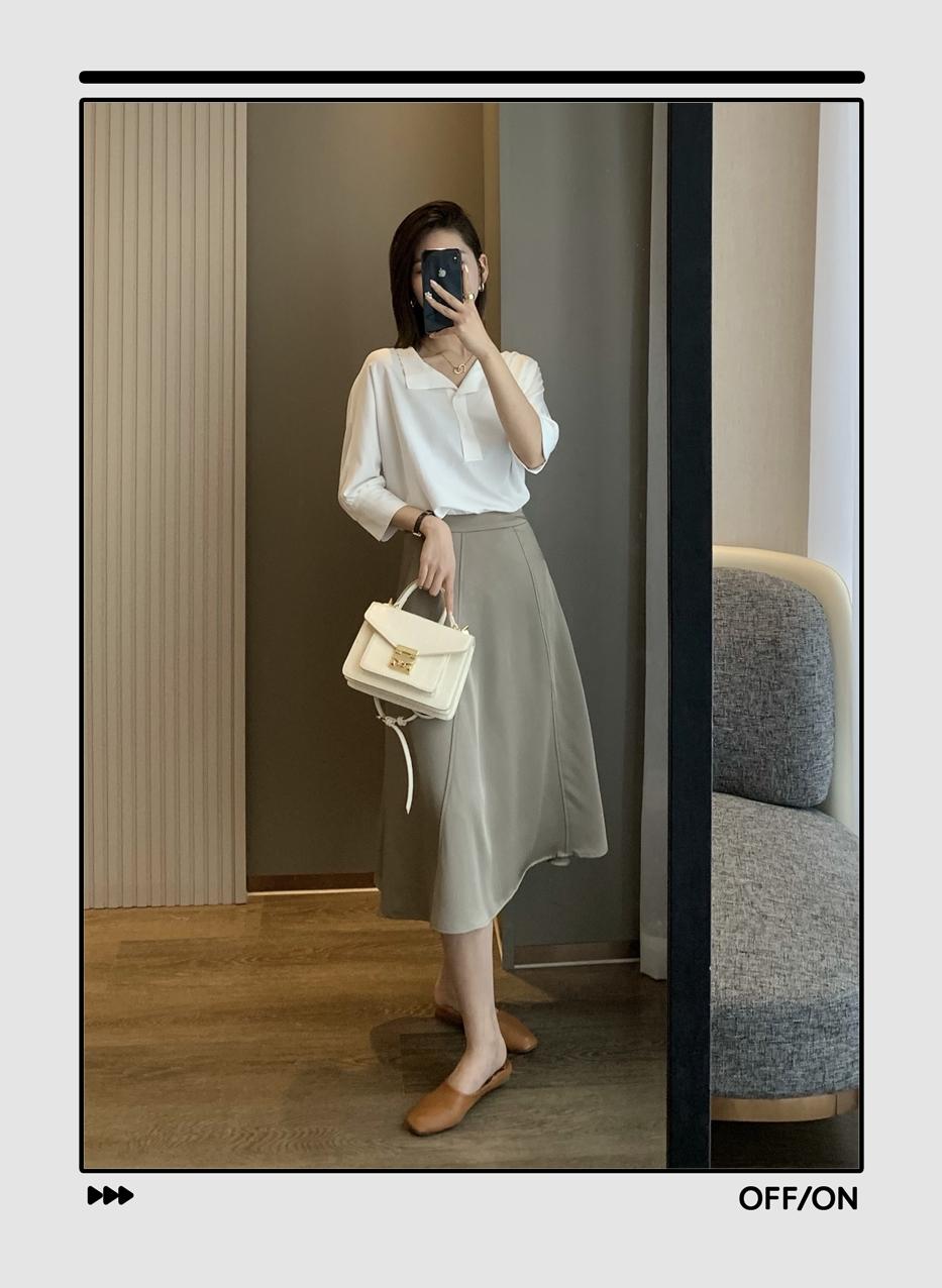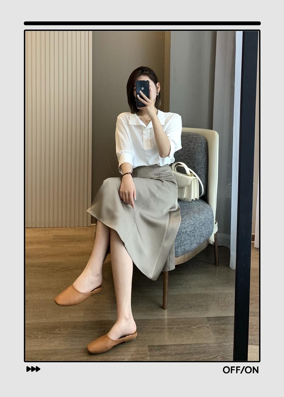 第二条A字裙我拿到手时,脑袋里就蹦出两个字高级。是仿醋酸质地,触感超级软滑,而且特别好打理。 裙身是中长款一片式斜裁,不挑腿型,微微高腰的设计,不挑人穿。 上班的时候我特别喜欢搭一件 白色衬衫 ,刚刚立秋