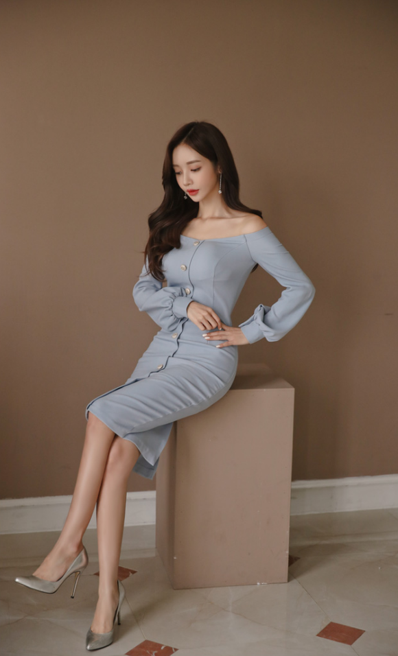 孙允珠美人赏析 孙允珠束扣直筒及膝裙 大秀香肩美背翘臀迷人(2)