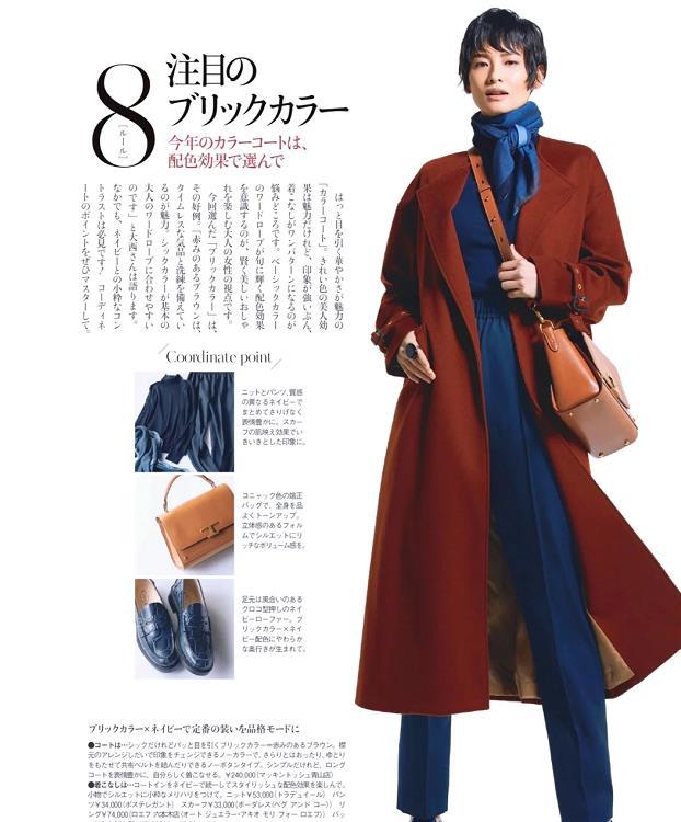 这一件枣红色长大衣,比较推荐中年后的女人们穿,很显优雅和大气,关键是还很不失成熟稳重的味道。内搭利用了同色系的组合,真的不用担心会出错,深蓝色打底+同色系西装裤,干练又不失利落感,无论是上班职场,还是日常逛街都适合!
