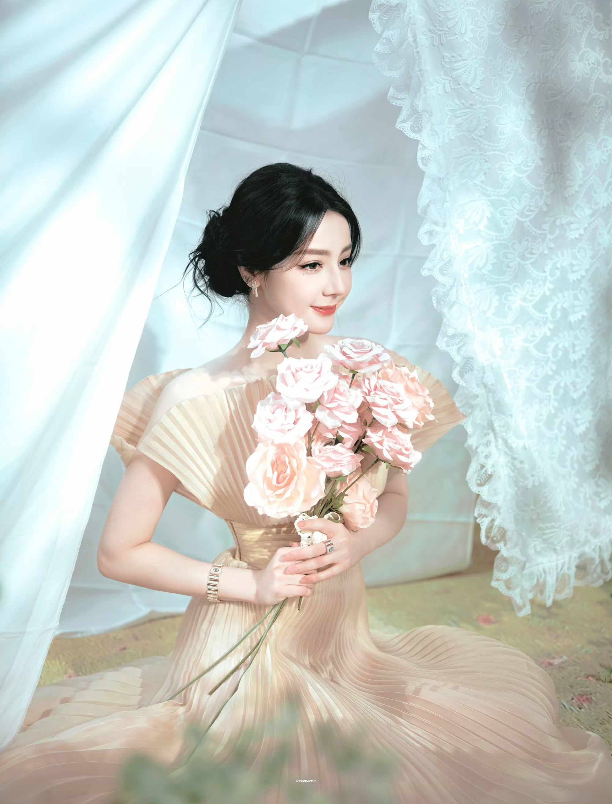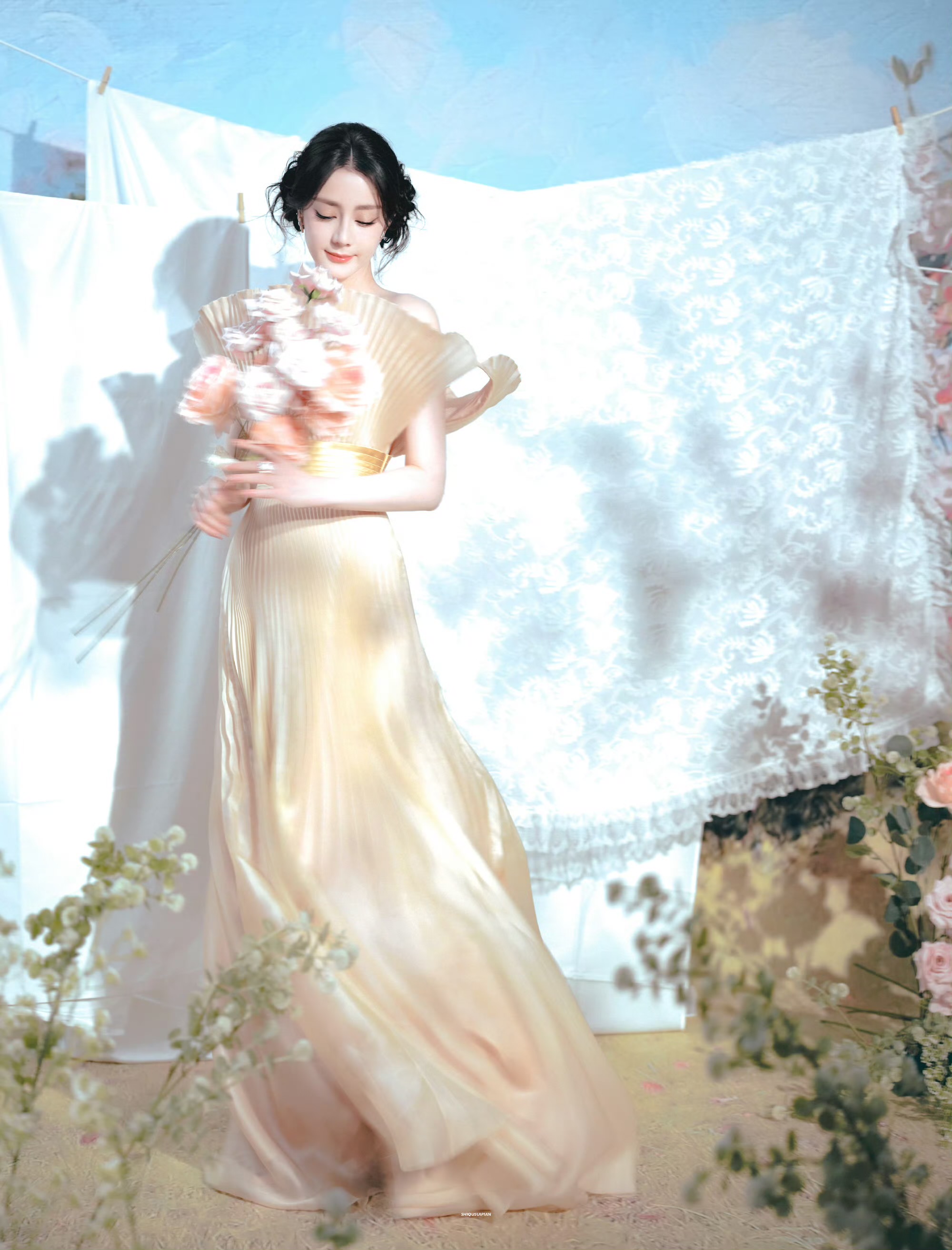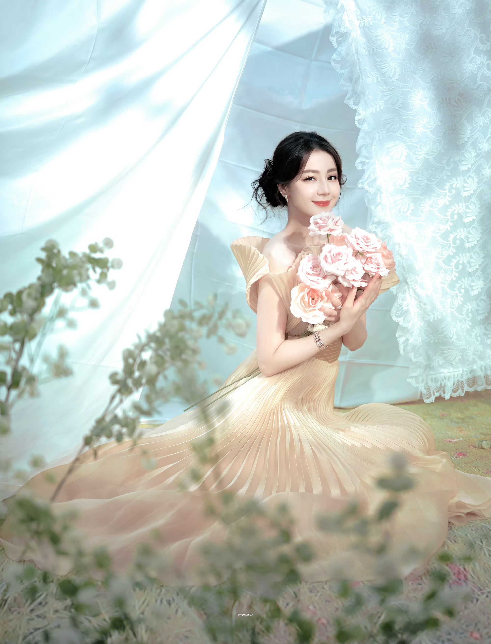 场景置景采用油画质感的漫反射布光逻辑,哑光布幔与蕾丝背景弱化硬光,前景绿植与粉玫瑰构建画面景深,以自然色调与礼服形成和谐的色彩渐变,完整落地了“春日浪漫”的主题叙事,最终呈现出兼具高级感与氛围感的时尚作品。