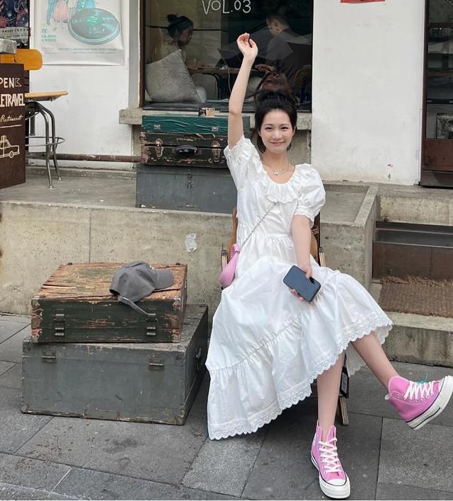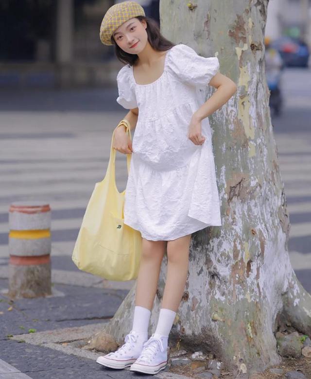 脚下选择一双白色帆布鞋来配,干净的白色鞋子与裙子组合在一起,一点违和感都没有,同色系的穿搭,和谐又耐看。