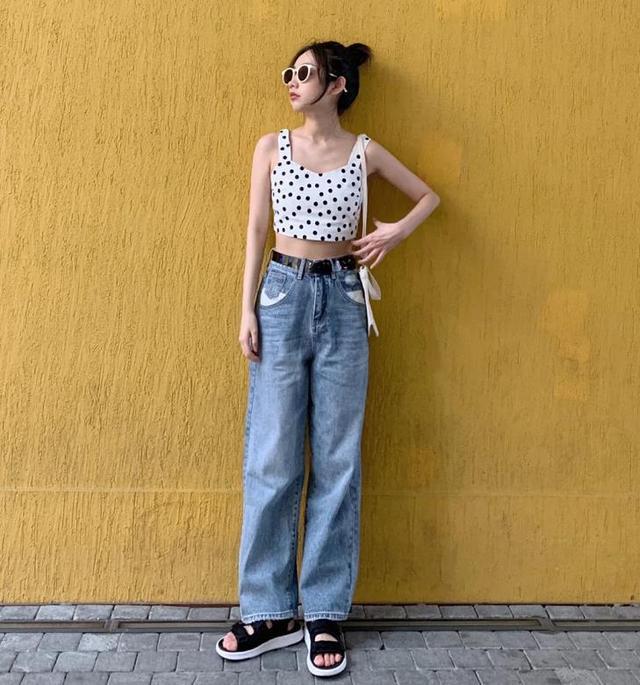 穿法Look1:波点小背心上衣+直筒牛仔长裤+运动凉鞋