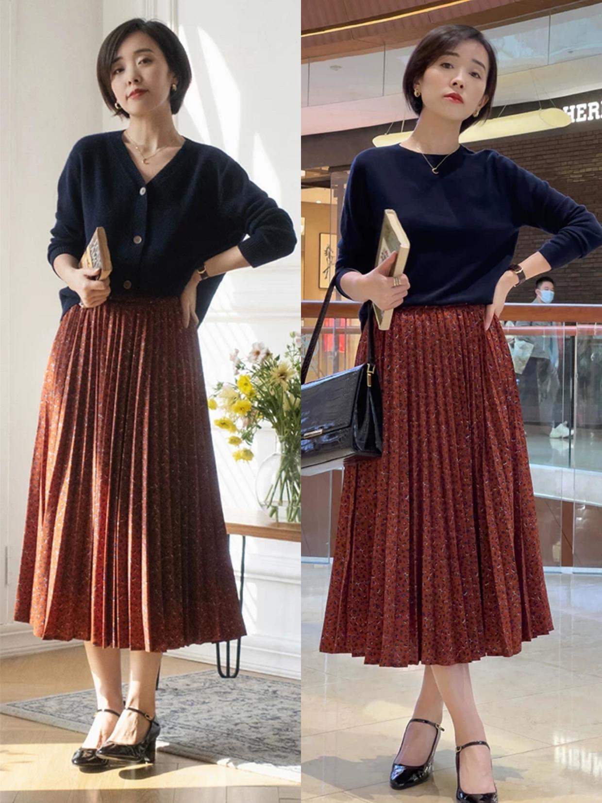如果你觉得纯色款的百褶裙看起来太单调,也可以试试碎花款的红色百褶半身裙,整体以深红色为主色调,点缀了细碎的黄色碎花,虽然它在裙身形成了满铺,但却不会过于喧宾夺主,反而注入了几分法式浪漫的风情,真的太有女人味了。可以搭配纯色的上装,这样就遵循了“繁简结合”的法则,有效避免了花哨。