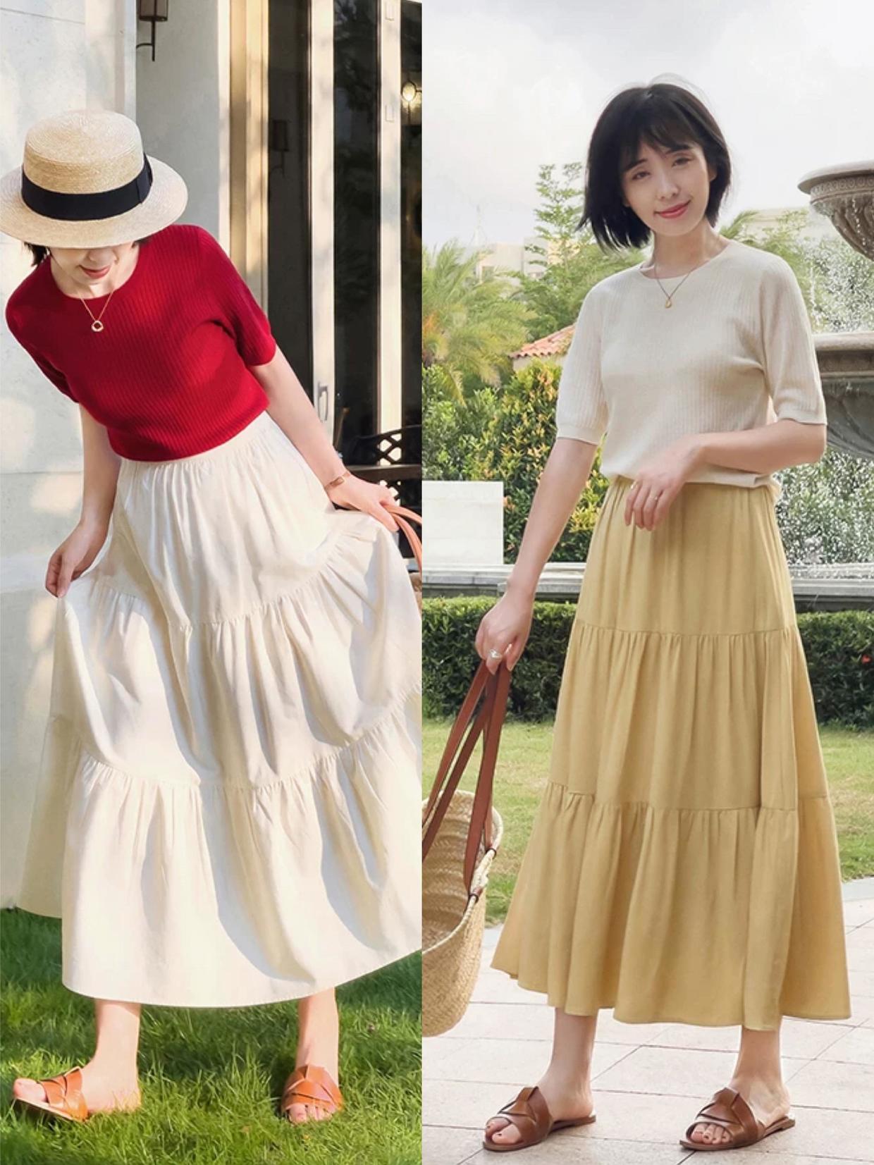 将A字裙与蛋糕裙摆的设计结合之后,会形成丰富的层次,特别有娇俏的小女人气质。半身裙的长度及脚踝,看起来就已经很仙气了,加上两处蛋糕褶皱设计,就注入了甜美可爱的气息,是用来减龄的绝佳选择,对于中年女性来说也不会显得过于甜腻。