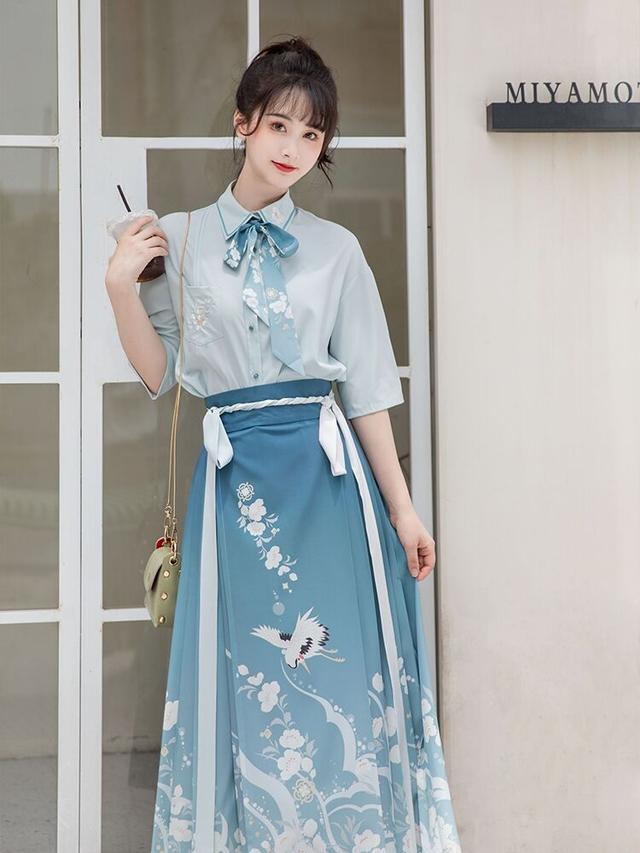 一定程度上说,马面裙在设计上更加的理性,而且能够结合女性去出发,款式上更尽民心。采取两大裙片组合而成,交叉叠搭和四个裙门衔接,利用裙门相互掩盖,系带固定在腰间,整体造型美而又能防走光。