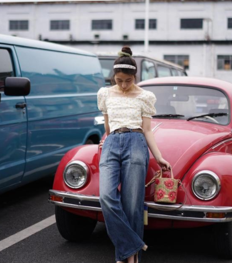 当你的上半身与一件花卉图案密集型的外套相匹配时,下半身的牛仔裤必须选择纯色风格,以避免图案装饰,因为外套的风格非常花哨,而稳定的下半身可以使整个形状更加和谐。