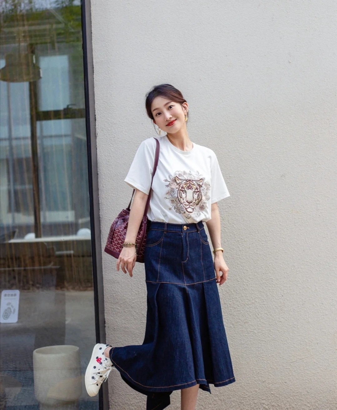 因此可以在衣柜里准备几条样式不同的过膝半身裙,像这条牛仔半身裙,它就重点强调出了青春活力的风采,和白色印花T恤或者是白色字母T恤的组合,更是能强化减龄的属性与修饰年龄的特征。