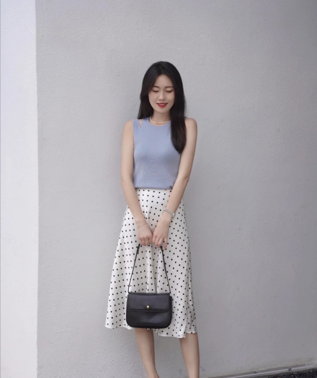考虑到颜色对服装搭配潜力的影响,最好还是要准备几款色系具备超高兼容性的裙装单品。比如这款白色的波点半身裙,黑色占据小面积,不会放大压抑气息,白色占据更高的比例,加入了清爽感和简约的氛围。搭配蓝色的无袖上衣,舒服又清凉,清爽又大方。