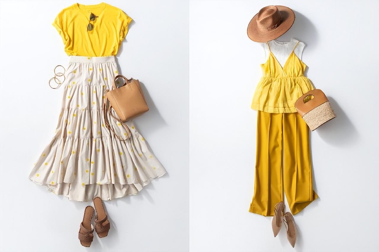 唤醒仲夏倦怠感的亮黄色,绝对是想在夏天穿搭的热门颜色,用米色和棕色协调非常重要,如果搭配白色,对比度会太强,可以解决看起来幼稚的问题。