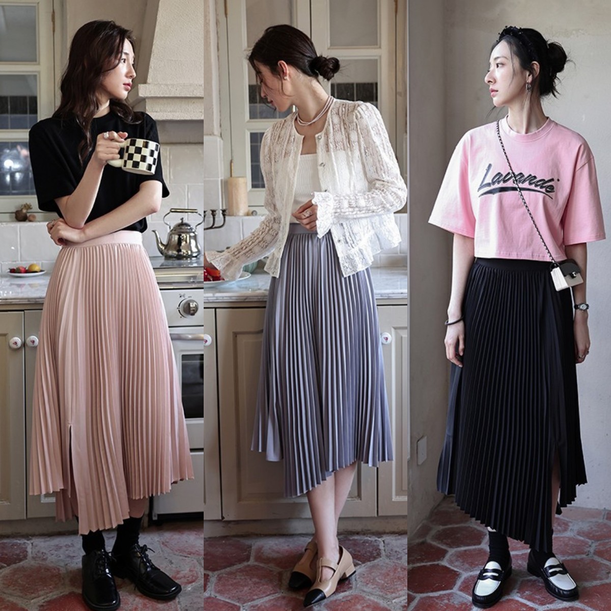 当半身裙的款式比较个性的时候,上衣的搭配就要简约基础一些,去营造整体的一个平衡状态。对于气质比较成熟的女性而言,这款不规则裙摆的百褶半身裙层次感十足,遮肉作用也非常不错,不对称剪裁的裙摆,若隐若现的露出小腿肌肤和脚踝,再加上阔摆版型优雅又知性。